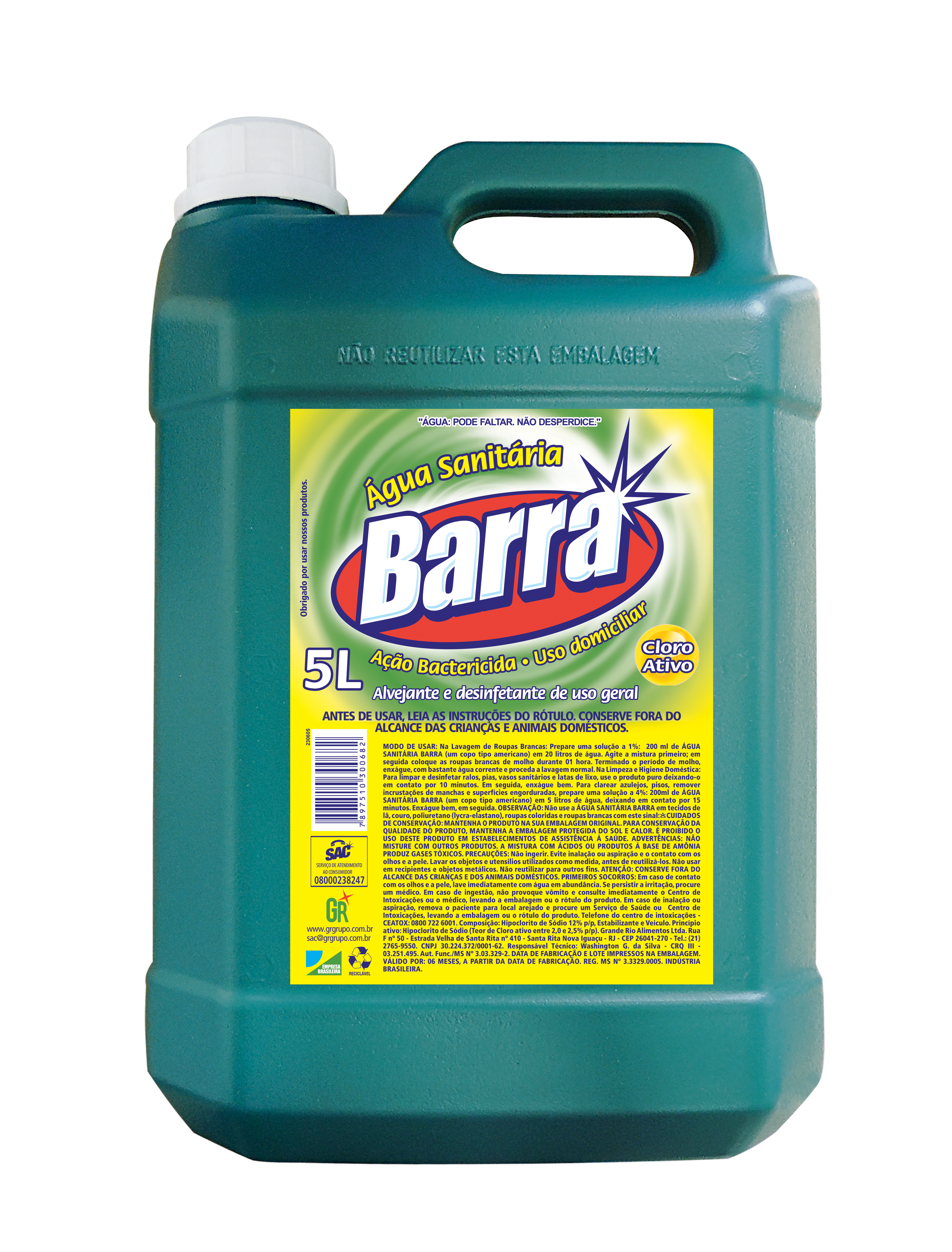 Para limpar e desinfetar ralos, pias, vasos sanitários e latas de lixo, use o produto puro deixando-o em contato por 10 minutos. Em seguida, enxágue bem. Para clarear azulejos, pisos, remover incrustações de manchas e superfícies engorduradas, prepare uma solução a 4%: 200ml de ÁGUA SANITÁRIA BARRA (um copo tipo americano) em 5 litros de água, deixando em contato por 15 minutos. Enxágue bem, em seguida.